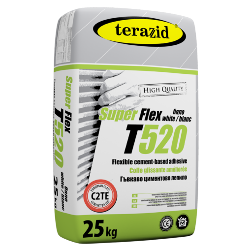 SUPER FLEX T520 е гъвкав циментов разтвор за залепване на фаянс, теракота, гранитогрес и каменни облицовки и настилки. Подобреният състав на лепилото и високите якостни показатели определят приложението му за: